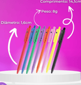 Canetas plásticas corpo branco com detalhes coloridos. Clip plástico e detalhe inferior emborrachado com relevo, acionador e ponteira prateada (plástico) acionado por clique.