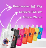 Squeeze dobrável de plástico com 480ml. Squeeze colorido acinturado com mosquetão superior de acordo com a cor do squeeze, possui tampa de bico texturizada e protetor plástico para o bico (com alça).