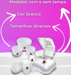 Produtos descartáveis em isopor de diversos modelos, dentre eles, potes de açaí, sorvete, sopa, marmitex e sobremesa de todos os tamanhos com uma excelente qualidade.